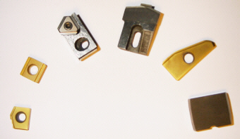 von links: TiN beschichtete Schneidplatte für Vollbohrwerkzeug (ELB, BTA, Ejektor), TiN-Wendeplatte (Zwischenschneide BTA), Aufbohr-Wendeschneidplatte(BTA), in Kassette eingelötete Kernbohrwerkzeugschneidplatte, TiN-Formschneidplatte, Schälmesser
