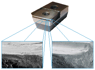 Oberflächenzerrüttung, verstärkter Materialabtrag an der Leistenoberfläche Zusammenspiel mehrerer Verschleißmechanismen, Zerstörung des Zusammenhalts im Leistenmaterial, Ausbrüche, Werkstückstoffeinlagerungen mit